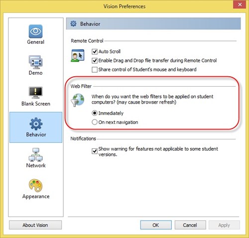 Его можно обновить сразу, тогда браузер будет обновлен при применении веб-фильтра или при подключении к классу. Это соответствует тому режиму, в котором работают предыдущие версии Vision Pro.